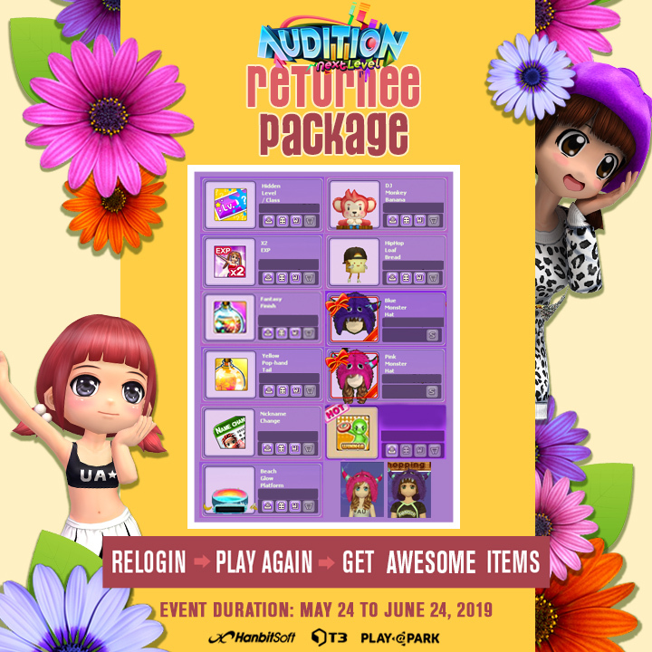Starting May 24, 2019, to July 27, 2019, get special gifts just by logging in. The ANL Returnee Package is here! Insertion will start after the event.