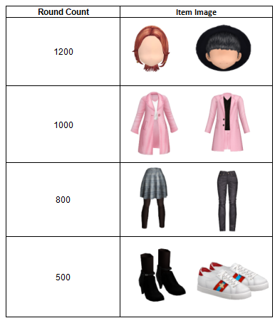 - Update: 1200 Round Count has been deducted to 1000. For 1000 Round Count, players will be getting the Hair and Top Categories.
