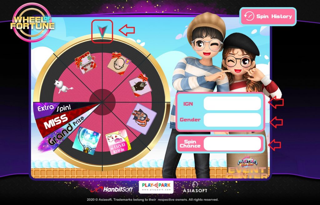 - Click on the Arrow (Middle of the Wheel) to start spinning. The item will be determined when the wheel is stopped spinning.