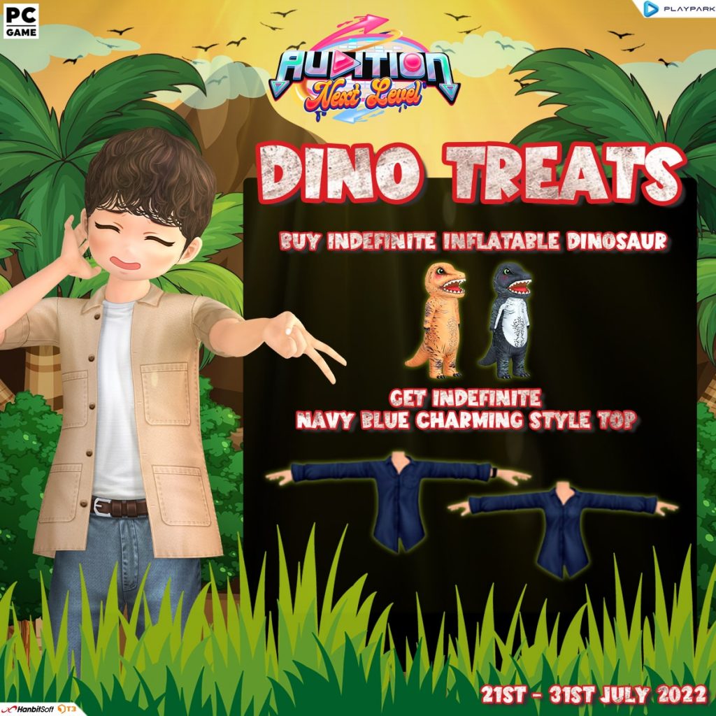- All players who will purchase the Inflatable Dinosaurs with Indefinite duration from 21st July 2022 – 31st July 2022 11:59 PM (GMT +8), will get Indefinite Navy Blue Charming Style Top.