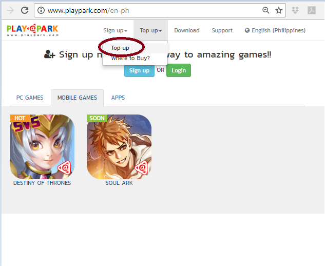 - Got to Playpark.com and click on “Top Up”