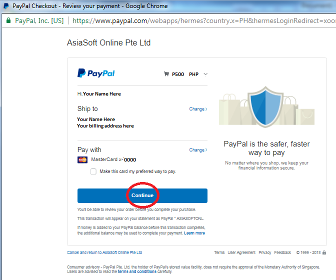 - Paypal confirmation page will be shown. Click “Continue” to proceed with payment